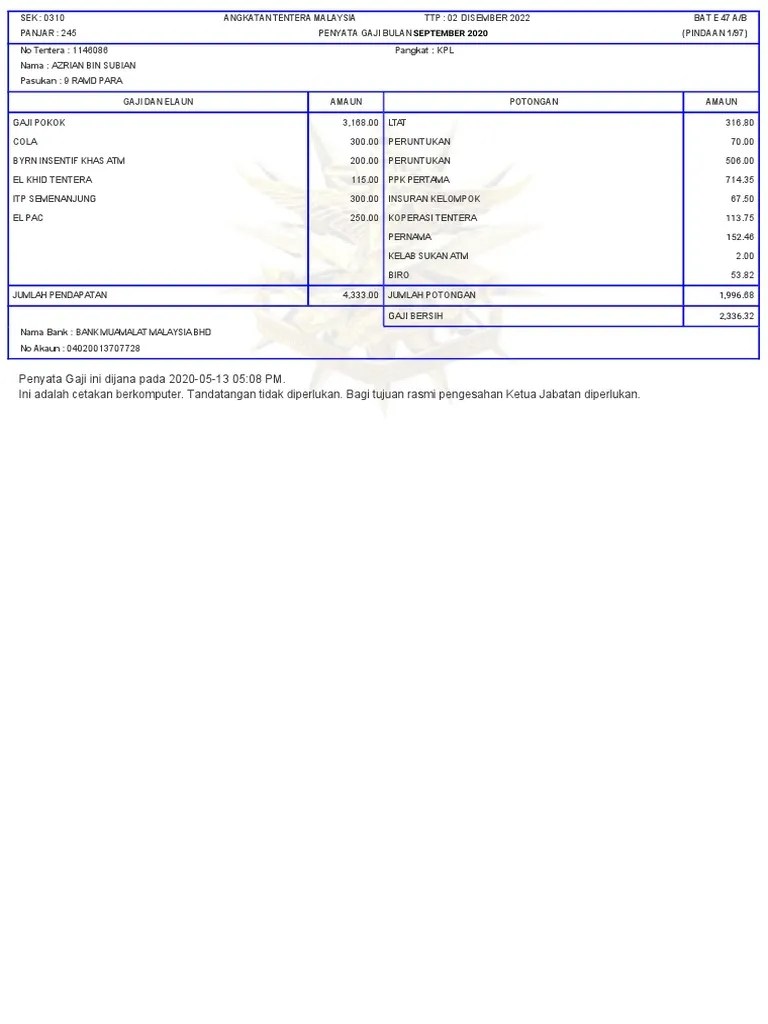 Masukkan nombor kad pengenalan dan no gaji. Jumlah termasuk elaun khidmat (rm115) dan bayaran khas atm (rm200) kenaikan tahunan.